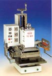 This machine is a semi-automatic toggle action 2-ton press that can be activated with dual hand buttons or with foot pedal. The machine comes equipped with an electric eye and mechanical safety device to allow foot pedal activation to be used. The machine is also equipped with an automatic slide worktable for easy placement of parts, mechanical counter, electrical dwell time control, electric foil pull assembly and a stamping head adjustment of up to 6 inches of extra clearance.